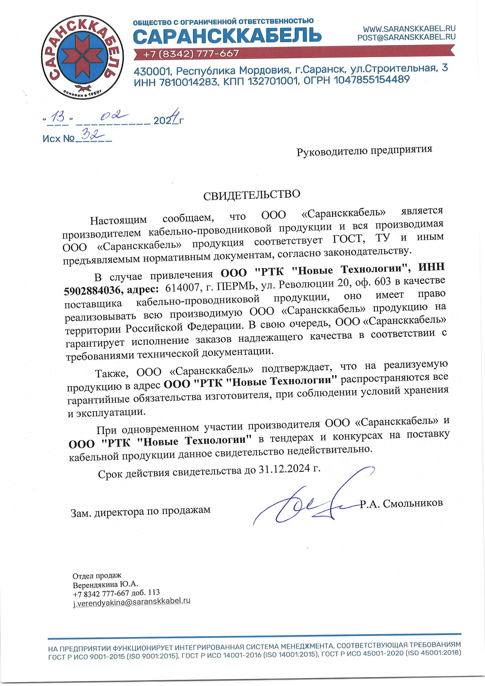 Свидетельство ООО "САРАНСККАБЕЛЬ"