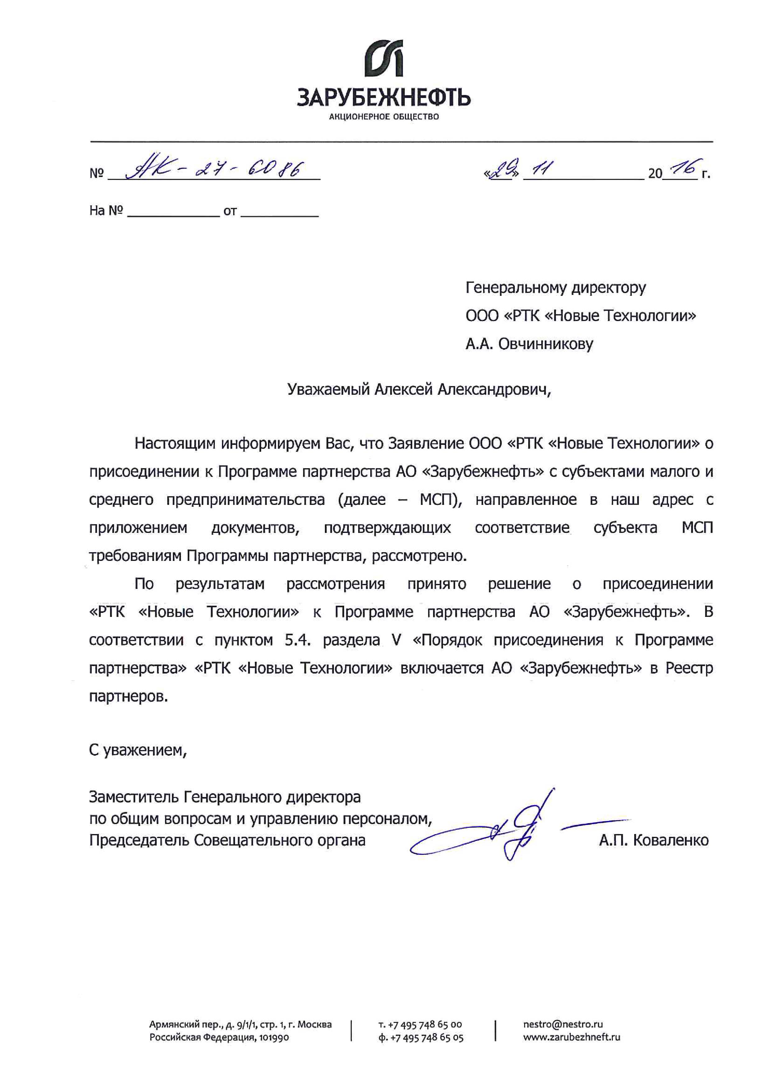 В ноябре 2014 года ООО "РТК "Новые Технологии" успешно прошло сертификацию на соответствие всех процессов системы менеджмента качества по требованиям международного стандарта ISO 9001:2011
